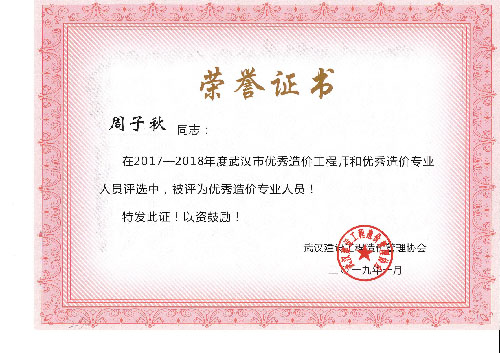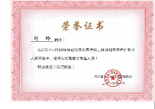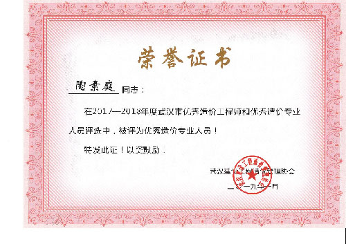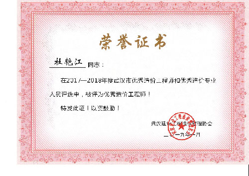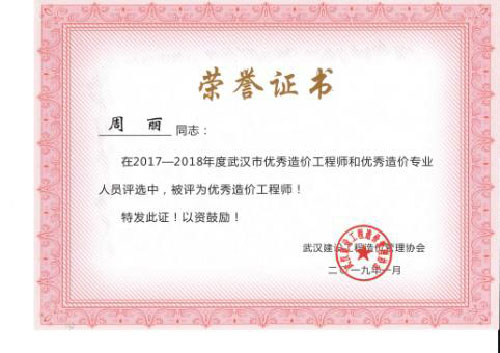 與時俱進、開拓進取——熱烈祝賀我司周麗等6名同志榮獲“2017-2018年度武漢市優(yōu)秀造價工程師和優(yōu)秀造價專業(yè)人員”