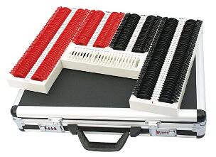 驗光鏡片箱包含箱體、箱蓋和扣件,箱體分區排布用于驗光試鏡的鏡片插槽,其中,箱體的左、右兩側分別為負球鏡片區和正球鏡片區,該 兩區之間的左側為負柱鏡片區,右側為正柱鏡片區,各區有序排布相應 序列鏡片的橫向插槽,并標有試鏡片的辨識符號;其特征是箱體還設有 附屬鏡片插槽,棱鏡片插槽和漸進多焦點鏡片序列插槽,該三序列共分 布為左右兩個區,左區對應位于負柱鏡區下方,右區對應位于正柱鏡區 的下方;左區設有24個橫向插槽,共分為12排,每排含有左右兩個插槽,包括附屬鏡片序列中的12個插槽和棱鏡片序列12個插槽,各槽標有對應鏡片的辨識符號。